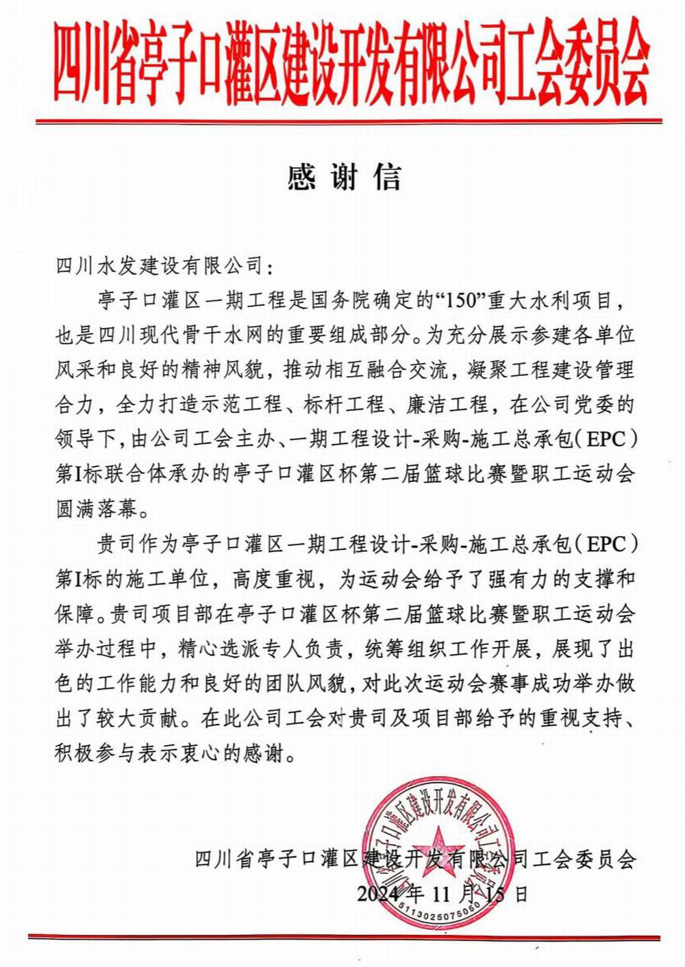 近日,公司收到來自四川省亭子口灌區(qū)建設(shè)開發(fā)有限公司發(fā)來的感謝信,對公司亭子口項目協(xié)助圓滿承辦亭子口灌區(qū)杯第二屆籃球比賽暨職工運動會活動表示誠摯感謝。