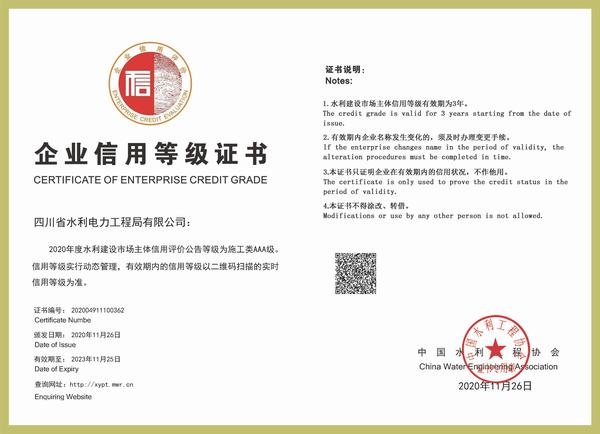 水利建設(shè)市場(chǎng)主體信用AAA證書