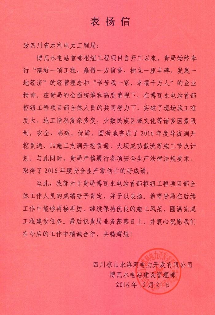 博瓦水電站建設(shè)管理部致工程局表揚(yáng)信