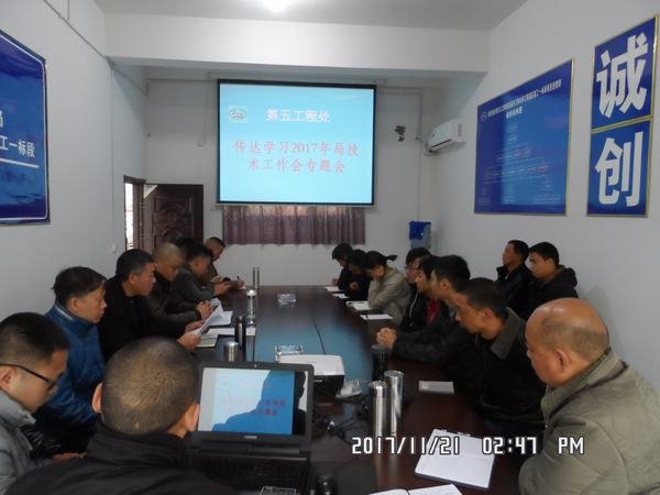 2017年11月21日下午,第五工程處在安岳縣關刀橋水庫灌區一標段項目部會議室召開專題會議,傳達學習2017年局第十三次技術工作會議精神。會議由處長陳道剛主持。
