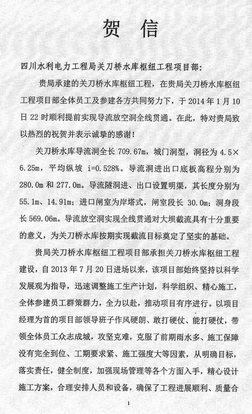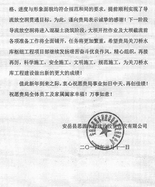安岳縣思源水利建設(shè)投資開發(fā)有限公司致工程局賀信