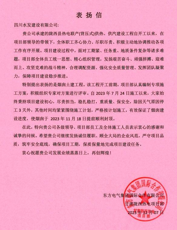 2023年12月7日,東方電氣集團國際合作有限公司致信四川水發(fā)建設有限公司,就公司隴西縣熱電聯(lián)產(chǎn)(背壓式)供熱、供汽建設工程項目,特別是作為主體工程的煙囪提前三天順利封頂表示感謝。