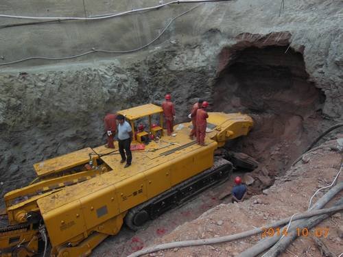 經(jīng)過1周時(shí)間的安裝,工程局第一臺懸臂式掘進(jìn)機(jī)于 2014年10月7日在王家坪隧洞出口工作面掛口正式投入運(yùn)行,武引二期西梓干渠第五標(biāo)段隧洞工程由此進(jìn)入施工高峰期。