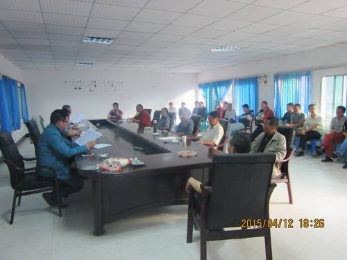2015年4月12日,第一工程處在云南省鹽津縣萬(wàn)年橋電站項(xiàng)目部組織職工傳達(dá)學(xué)習(xí)工程局2015年工作會(huì)議精神,第一工程處范雪山處長(zhǎng)主持會(huì)議。