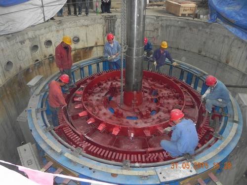 2015年5月31日15時28分,九龍峽水電站1號水輪發電機組轉子順利進入1#水輪發電機組機坑,成功吊裝就位。