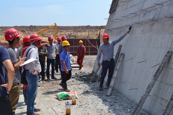隨后,檢查組對(duì)鋼筋加工場(chǎng)地、廠房全年圍堰上、下游混凝土澆筑倉(cāng)號(hào)、廠房廠壩結(jié)合部位噴混凝土等作業(yè)現(xiàn)場(chǎng)進(jìn)行實(shí)地檢查。在廠房全年圍堰混凝土澆筑倉(cāng)號(hào)上,程靜、趙玉成對(duì)斜坡混凝土澆筑中出現(xiàn)的氣泡、漏漿給予分析和指導(dǎo),要求繼續(xù)加強(qiáng)結(jié)構(gòu)物尺寸、外觀質(zhì)量控制和養(yǎng)護(hù)工作。并指出了作業(yè)班組臨時(shí)施工用電不規(guī)范、現(xiàn)場(chǎng)材料堆碼不及時(shí)等不足現(xiàn)象。