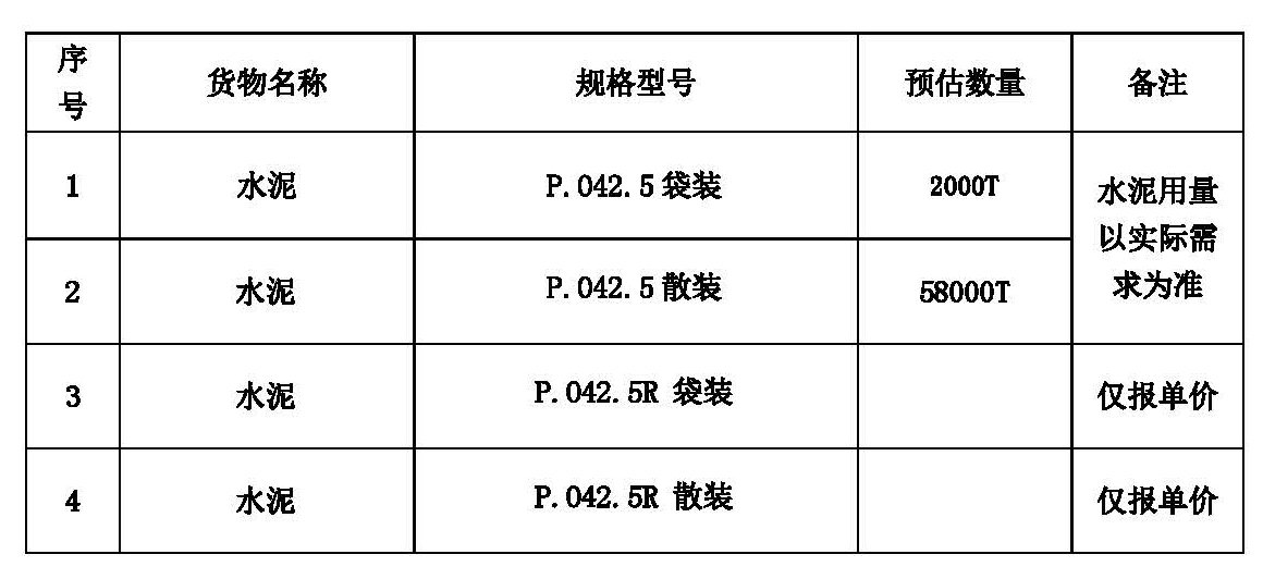 采購(gòu)范圍:水泥總用量約6.0萬(wàn)噸,采購(gòu)數(shù)量以實(shí)際需求數(shù)量為準(zhǔn)。工程施工總工期為42個(gè)月。
